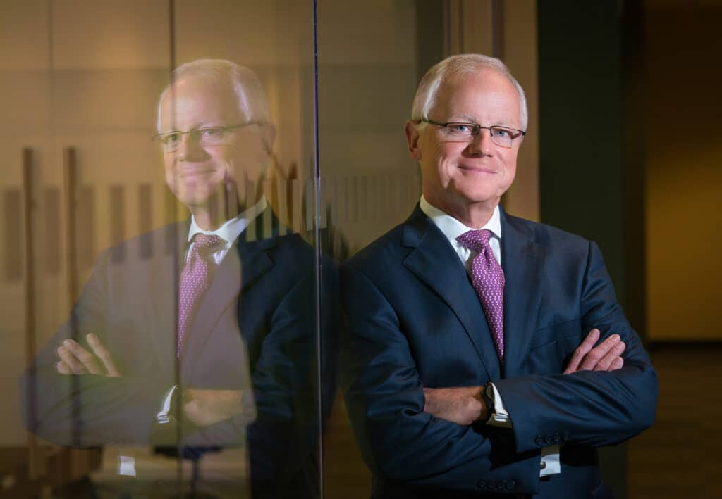 A modern Houston executive portrait with added dimension—using reflection and controlled light to create presence, credibility, and a “commissioned” feel in a real workplace setting.